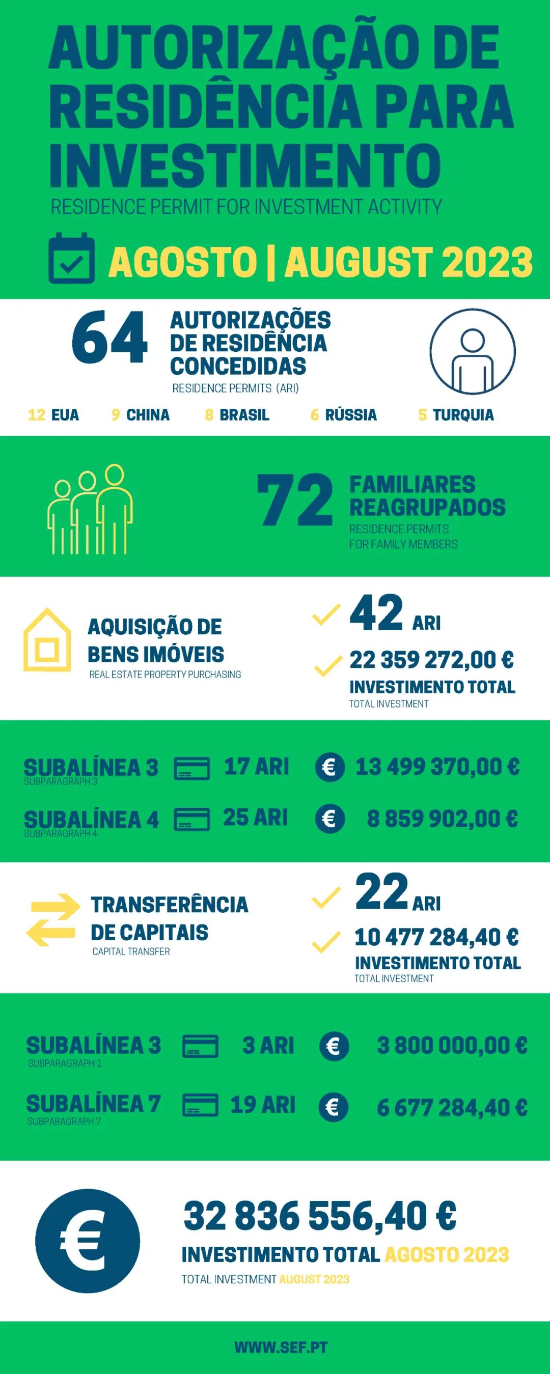 近日,葡萄牙移民局(SEF)公布了2023年8月黄金签证数据。2023年8月共有64位申请人获批葡萄牙黄金签证。其中,美国人拿下12份,中国人有9份,巴西人有8份,俄罗斯人有6份,土耳其人有5份。